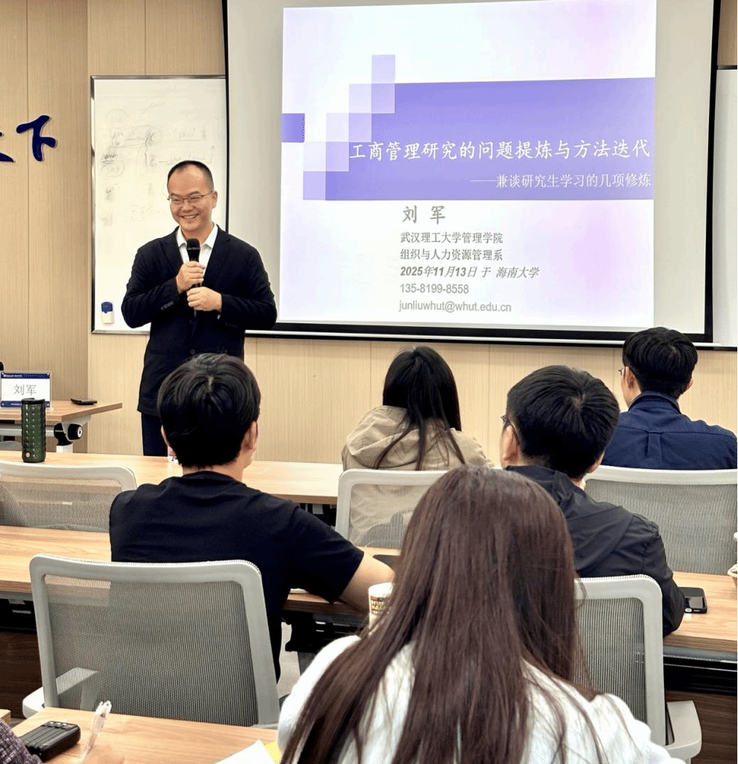 11月13日下午,国际商学院工商管理研究沙龙活动在社科楼B623顺利举办。武汉理工大学管理学院刘军教授应邀主讲。以“工商管理研究的问题提炼与方法迭代”为题。为学院师生带来一场兼具理论深度与实践指导意义的学术盛宴。本次工商管理系学术沙龙活动由学院副院长付景涛教授主持。