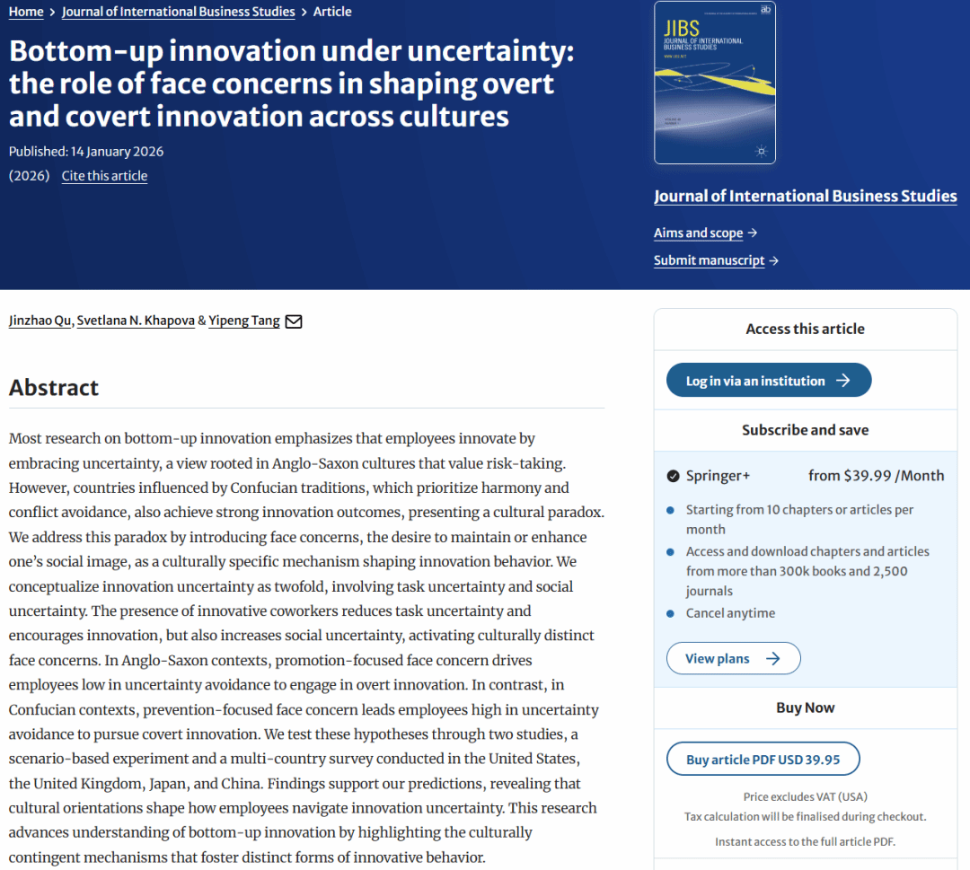 近日,国际商学院屈金照副教授作为第一作者,与阿姆斯特丹自由大学(Vrije Universiteit Amsterdam)Svetlana N. Khapova教授和中南财经政法大学汤一鹏副教授合作完成学术论文“Bottom-up innovation under uncertainty: the role of face concerns in shaping overt and covert innovation across cultures”在管理学领域国际顶级期刊Journal of International Business Studies正式在线发表。该期刊为UTD24期刊之一,是国际商科协会(Academy of International Business;AIB)的旗舰刊物,是国际商科公认的最高水平期刊,隶属伟德bv1946官网期刊分类目录英文A+类期刊。