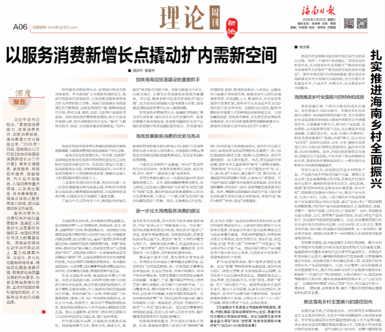 2026年2月25日,《海南日报》理论周刊版刊发了我院颜洪平教授撰写的文章《以服务消费新增长点撬动扩内需新空间》。