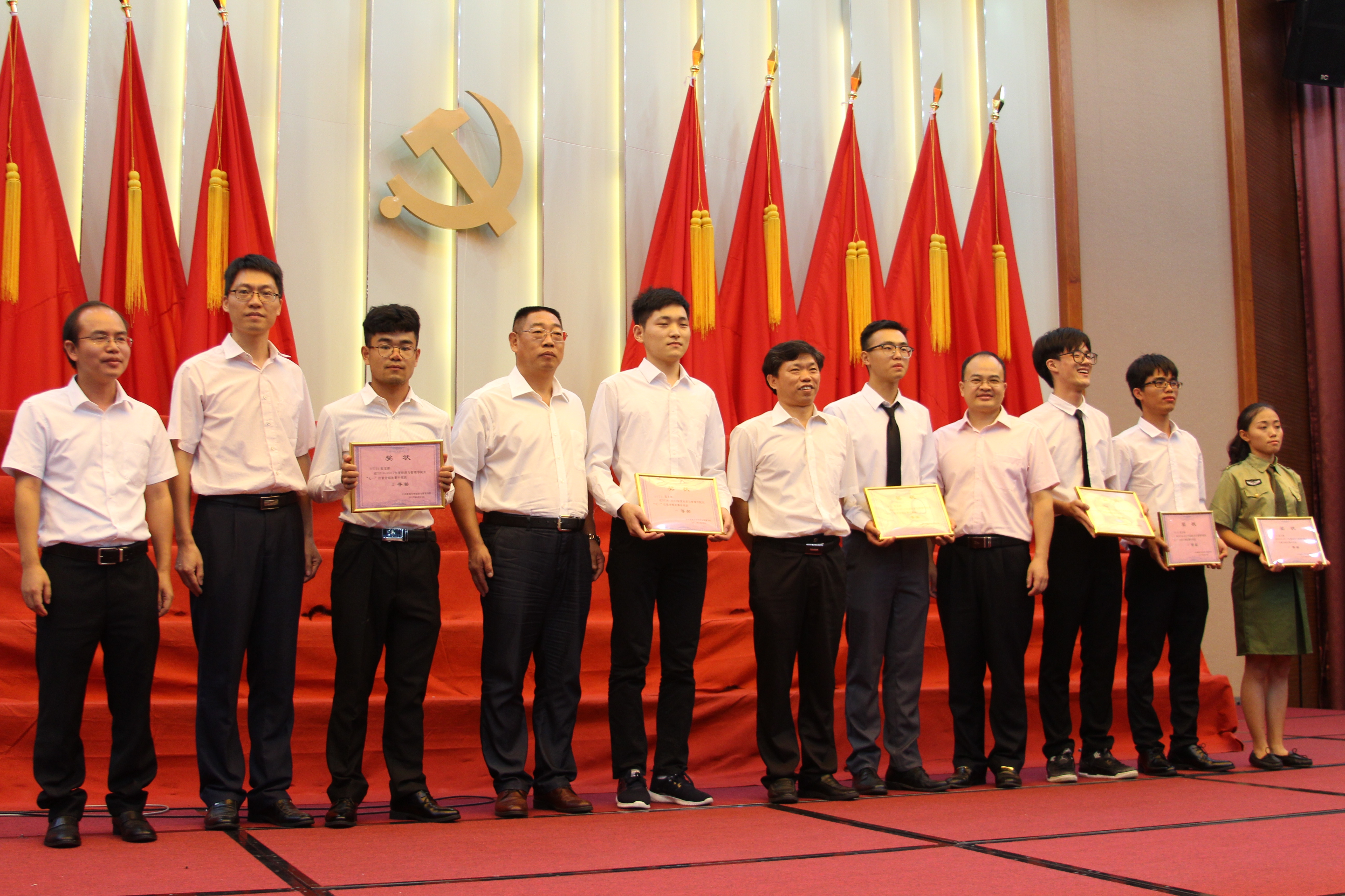 接着比赛开始,各个党支部的合唱团成员都精神抖擞,朝气蓬勃,用嘹亮的歌声、整齐的服饰、饱满的热情唱出了对党的无限热爱、对祖国的美好祝愿。会计学生党支部带来《光荣与梦想》,他们气势磅礴,听过之后让人血脉喷张;统计学生党支部的《精忠报国》唱出了保家卫国的决心;财管学生党支部的《走向复兴》表达出中国人民实现民族复兴理想的心愿;金融学生党支部的《爱因为在心中》表达了对党和祖国深深的爱意;国贸学生党支部的《春暖花开》抒发了对“爱、奉献、给予”的向往与呼唤,讴歌了人间大美大爱;管科学生党支部的《国家》表达了国家对人民的热爱,人民对国家的眷恋;工管学生党支部的《当那一天来临》用情景剧和歌声将我国解放军英姿飒爽、英勇向前的精神毫无保留地展现了出来;注会学生党支部的《在灿烂的阳光下》用朴实的语言抒发了对中国共产党创建新中国的感激之情;农经学生党支部的《不忘初心》表达了在实现梦想的道路上,不忘初心,时刻铭记祖国伟大复兴的使命的情感;硕士学生党支部的《共筑中国梦》表达了团结一致,共同创造祖国美好未来的决心;教工党支部的《走进新时代》歌颂了中国人民勤劳勇敢和无限智慧,表达对国家领导人和中国共产党的爱戴和尊敬之情。最后,注会学生党支部获得了第一名,院长胡国柳、院党委书记冯广波等学院领导为获奖支部颁奖,并合影留念。