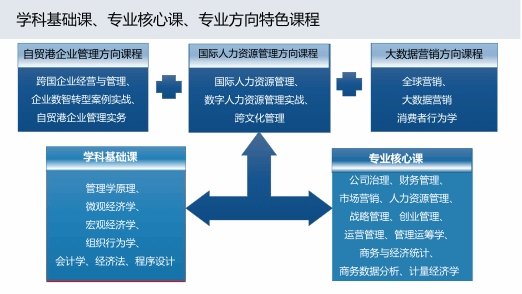 培养目标:为顺应我国新时代更高水平对外开放背景,结合国家开放型经济发展建设需要,培养立足海南自贸港、放眼世界,践行社会主义核心价值观,具有良好思想品质和道德修养,深厚的人文底蕴,宽厚的国际经济、商务、法律、管理基础理论和专业技能,宽广的国际视野,通晓国际规则,能够进行跨文化交流,具有强烈的创新意识和责任意识,融知识、能力、素质全面协调发展的有理想、有抱负、能从事国际商务经营、管理和研究工作的国际化、复合型高素质专门人才。