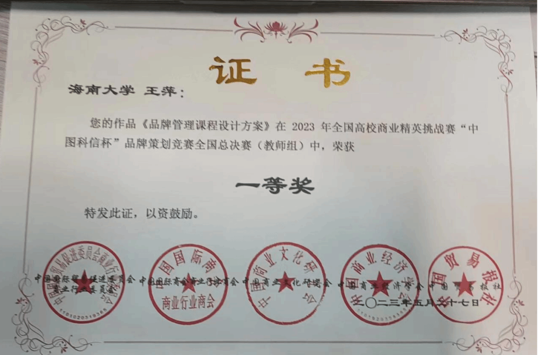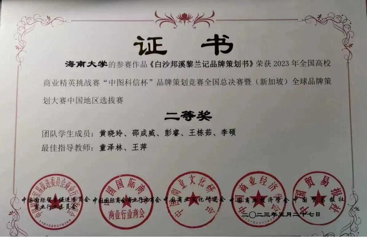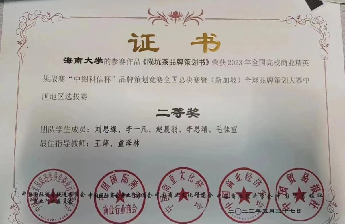 管理学院师生在5月28日闭幕的2023年全国高校商业精英挑战赛“中图科信杯”品牌策划竞赛全国总决赛暨(新加坡)全球品牌策划大赛中荣获佳绩。其中,教师组获全国一等奖,学生组获全国二等奖2项,同时,“海南天然茶叶有限公司”和“白沙邦溪黎佳山兰酒坊”两家企业获得优秀企业奖,“海南天然茶叶有限公司”还获得最具社会责任企业奖,这两家是管理学院在2023年承办的海南省乡村产业振兴带头人培育“头雁”项目的企业,通过比赛,助力品牌,赋能企业,推动了两家企业的品牌影响力,实现了管理学院的产学融合。