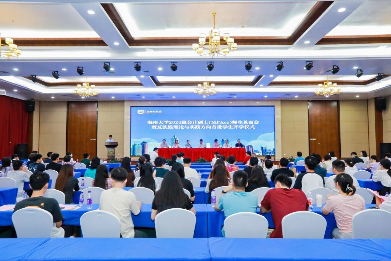 2024年9月28日晚上,伟德bv1946官网2024级会计硕士(MPAcc)师生见面会暨自贸港反洗钱方向首批学生开学仪式在国际学术交流中心和谐厅隆重举行。海南大学党委常委、副校长高佃恭,国际商学院党委书记南国芳,副院长许能锐、付景涛,会计系主任吴锡皓,会计专业硕士学术主任郭慧芳,中国人民银行反洗钱局相关领导,中国农业银行全球反洗钱中心总经理唐晓、中国人民银行海南省分行副行长黄革、中国农业银行海南省副行长张红梅等银行领导、会计专业硕士校内导师、行业嘉宾和会计专业硕士行业导师代表共一百余人出席本次会议。本次会议由国际商学院副院长许能锐主持。