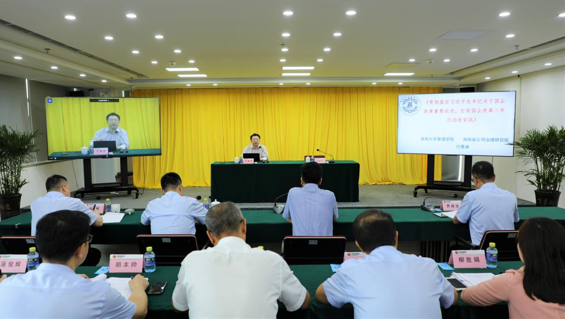 4月22日上午,海南大学管理学院副院长、海南省公司治理研究院副院长付景涛教授应邀赴国家能源集团海南电力有限公司,为该公司理论学习中心组学习(扩大)会作专题辅导,主题是《贯彻落实习近平总书记关于国企改革重要论述,打好国企改革三年行动收官战》,该公司党委书记、董事长李富军主持了理论学习中心组学习(扩大)会。
