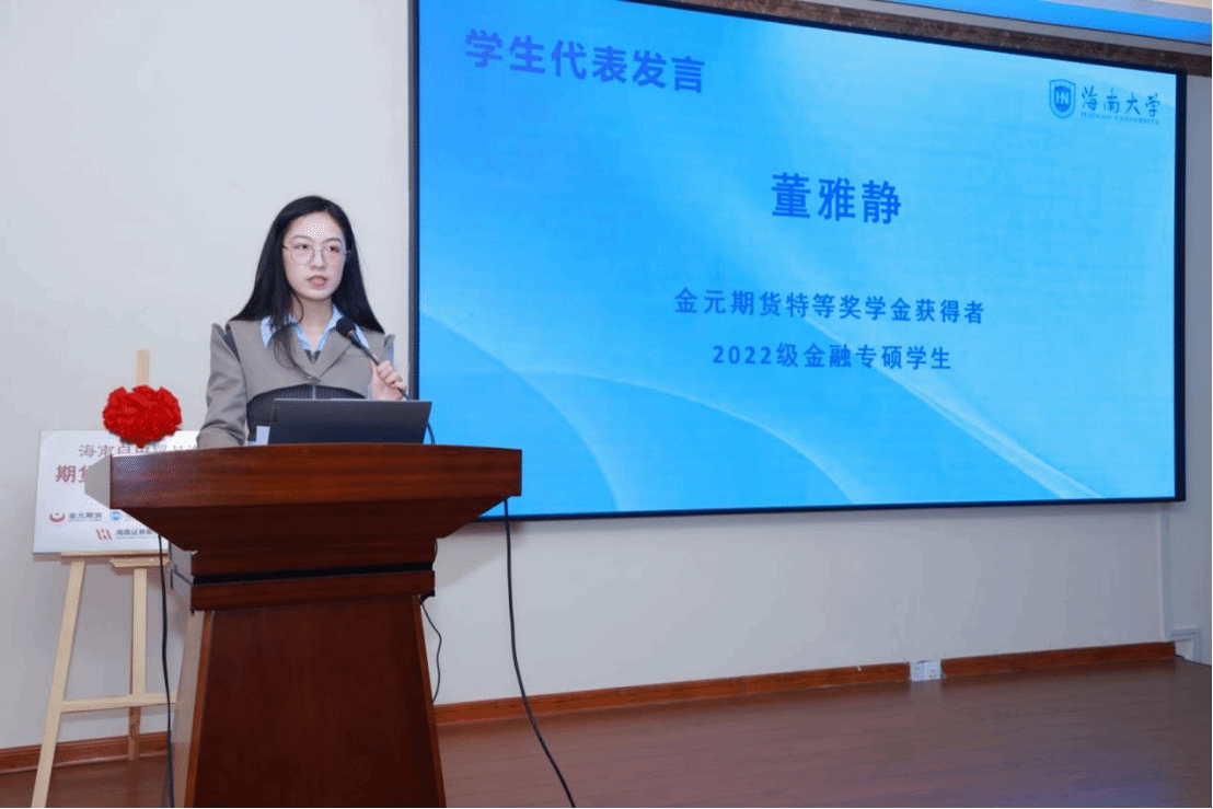 学生代表董雅静在发言中表示通过参与海南自贸港期货人才培养基地项目第二期,深刻感受到金融领域的活力与发展空间,同学们能够更加贴近市场的脉搏去感受国际化背景下金融市场的快速变化,在此基础上更深入地了解期货市场的运作机制、行业动态以及风险管理策略,这为同学们将来投身社会实践打下了扎实的基础,也为同学们日后择业就业积累了宝贵的经验。