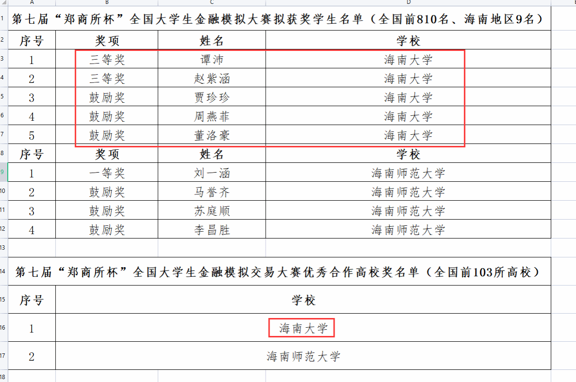 日前,第七届“郑商所杯”全国大学生金融模拟交易大赛成绩公布,海南大学荣获“优秀合作高校奖”,国际商学院获三等奖2项及鼓励奖3项。据统计,我校在前六届比赛中累计8名学生获奖,而今年,我校再次有5名学子脱颖而出,成功跻身全国810名获奖者之列,再次展现了我校学子的卓越风采。