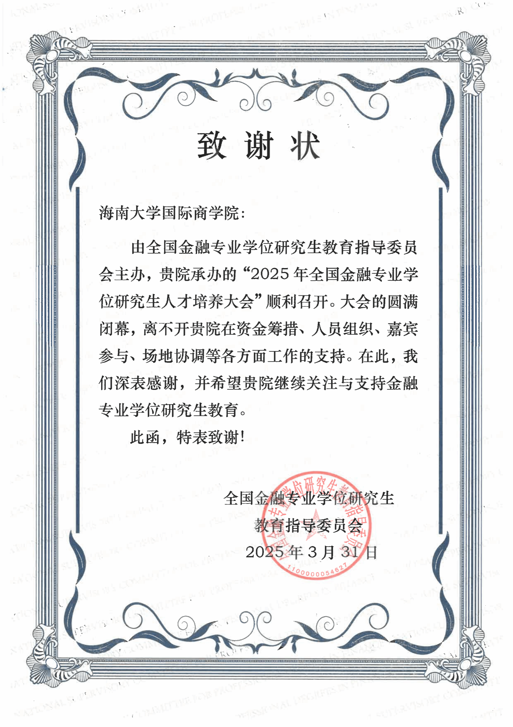 近日,伟德bv1946官网收到全国金融专业学位研究生教育指导委员会(简称全国金融专硕教指委)发来的致谢状,肯定学院对“2025年全国金融专业学位研究生人才培养大会”的出色承办。该会于2025年3月29日至30日在海南海口星海湾铂尔曼酒店召开。大会以“高水平金融开放与高质量金融人才培养”为主题,汇聚了来自全国百余所高校学科带头人、金融机构高管及行业专家等近300名代表参会,共商新时代金融教育改革与人才强国战略。