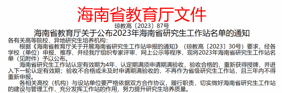 近日,海南省教育厅公布2023年海南省研究生工作站名单,共有40家单位入选。其中,由王丽娅教授牵头、伟德bv1946官网金融硕士学位点与海南省金融发展促进会联合申报并获批1个海南省首批研究生工作站。