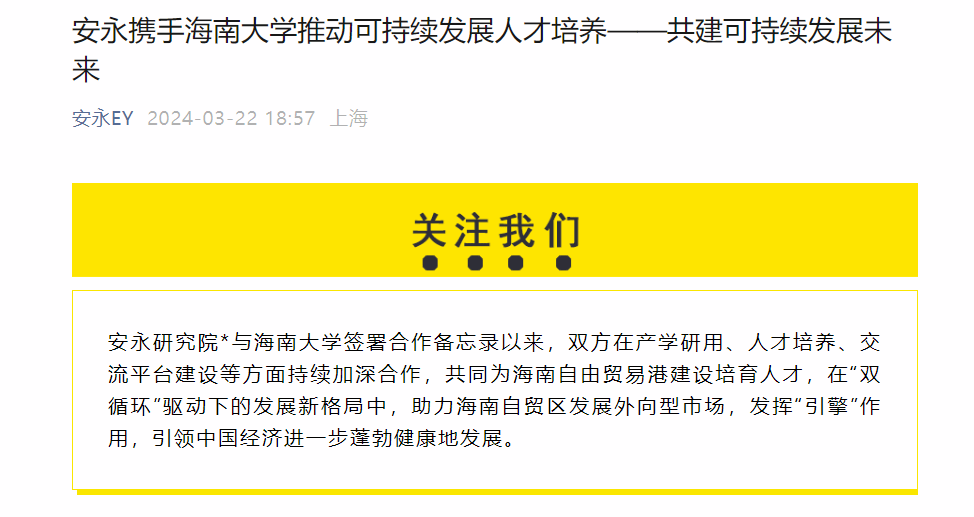 安永研究院公众号以“安永携手海南大学推动可持续发展人才培养——共建可持续发展未来”为题,对本次研讨会进行了特别报道。报道详细介绍了张彬女士在研讨会上的专题分享,她深入分析了全球可持续发展披露体系的发展历程和中国在该领域的里程碑,同时提供了企业应对国际ESG披露准则发展的策略建议。此篇公众号推文到本文发文前点击量800+。
