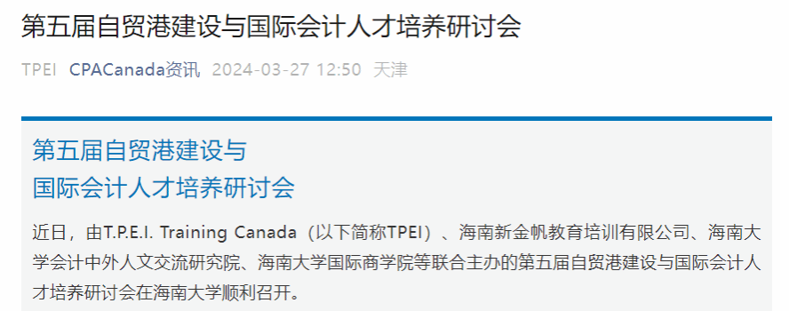 CPACanada资讯公众号以“第五届自贸港建设与国际会计人才培养研讨会”为题进行了报道,突出了会议在推动会计教育与实践创新方面的重要性。报道详细介绍了会议的核心议题,包括ESG报告的国际准则、AI技术在会计教育中的应用,以及如何培养适应未来市场需求的国际化会计人才。此篇公众号推文到本文发文前点击量100+。
