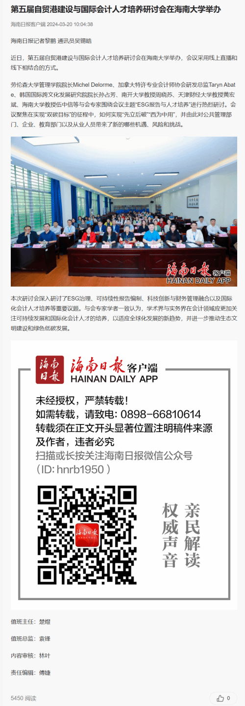 《海南日报》以“第五届自贸港建设与国际会计人才培养研讨会在海南大学举办”为题,重点阐述了参与专家、研讨议题、会议主题与目标。此篇文章到本文发文前阅读量达5000+。