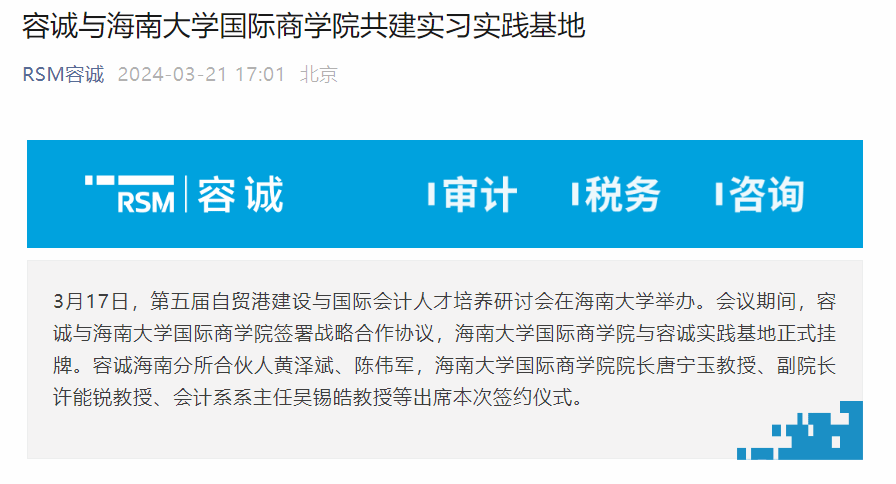 容诚会计师事务所公众号以“容诚与伟德bv1946官网共建实习实践基地”为题对本次研讨会进行了报道,详细阐述了容诚会计师事务所与伟德bv1946官网在会议期间签署的战略合作协议,以及随后进行的实习实践基地挂牌仪式。容诚合伙人黄泽斌对海南大学的信任表示感谢,并展望了双方在人才培养、实习实践基地建设等方面的深度合作前景。此篇公众号推文到本文发文前点击量400+。