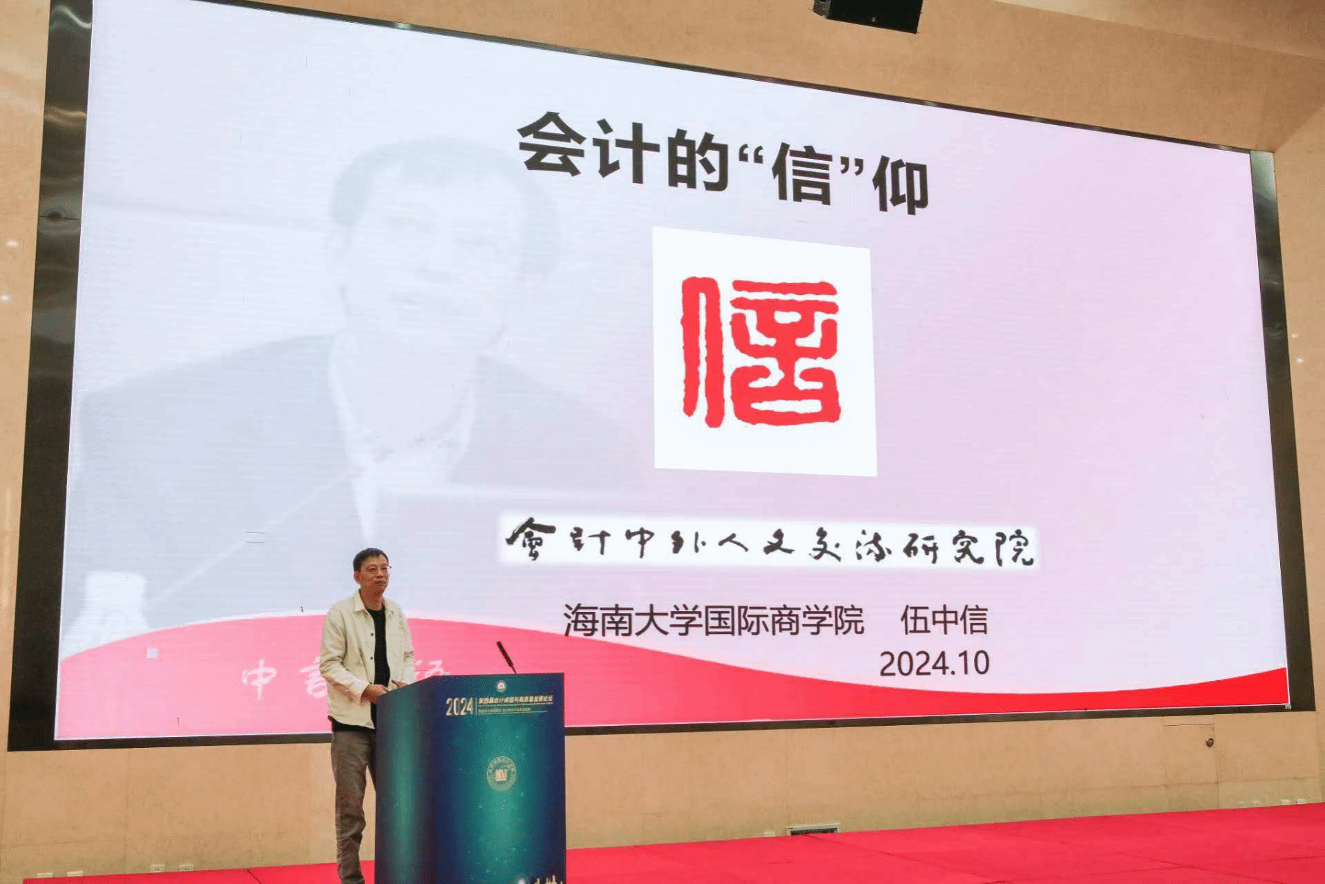 海南大学会计中外人文交流研究院理事长伍中信教授应邀参加,并在论坛上做了题为“会计的‘信’仰”的主旨演讲。伍中信教授从传统文化与现代产权的结合视角谈会计的诚信建设问题;从马克思主义与中华优秀传统文化结合的视角理解马克思主义中国化时代化,体现人类文明新形态的中国力量和会计贡献。他的发言得到与会者的高度认可。