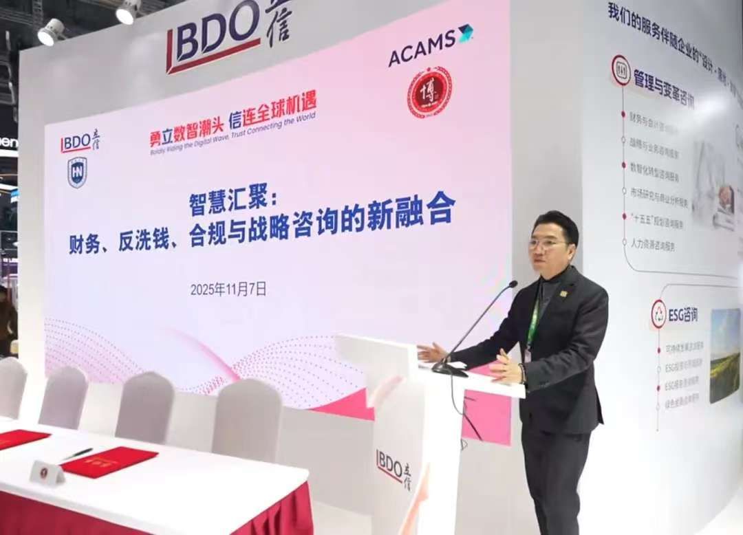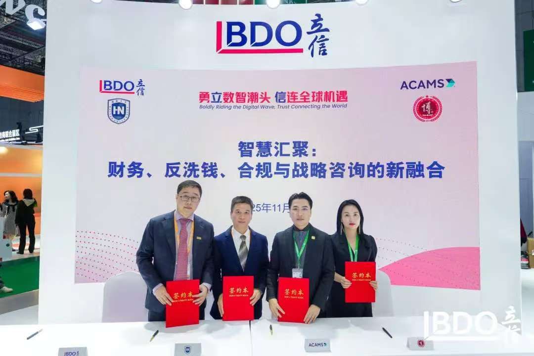 2025年11月7日下午,第六届中国国际进口博览会现场,伟德bv1946官网与立信会计师事务所(特殊普通合伙)、国际公认反洗钱师协会(ACAMS)、澳门博士智库签署战略合作协议,旨在融汇全球智慧,服务海南自贸港,共同构建新时代高标准的“财税合规-反洗钱”服务生态圈。