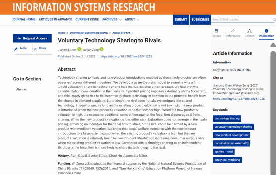 我院教师曾维君副教授以共同第一作者(作者名单按字母排序)、唯一通讯作者身份,在Information Systems Research期刊在线发表题为“Voluntary Technology Sharing to Rivals”的学术论文。Information Systems Research是国际商业研究领域的重要学术期刊,属于UTD24期刊之一,隶属伟德bv1946官网期刊分类目录A+类期刊。